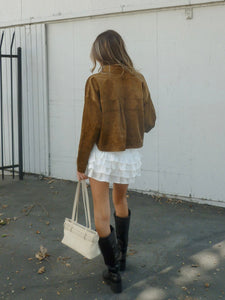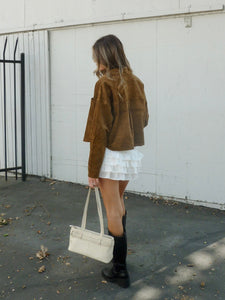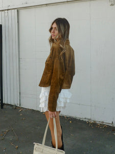 Designed with a boxy, slightly oversized fit, this versatile piece features a classic point collar, front button closure, and two patch pockets for a polished yet casual vibe. The soft suede texture adds a touch of sophistication, making it a perfect transitional piece for fall.